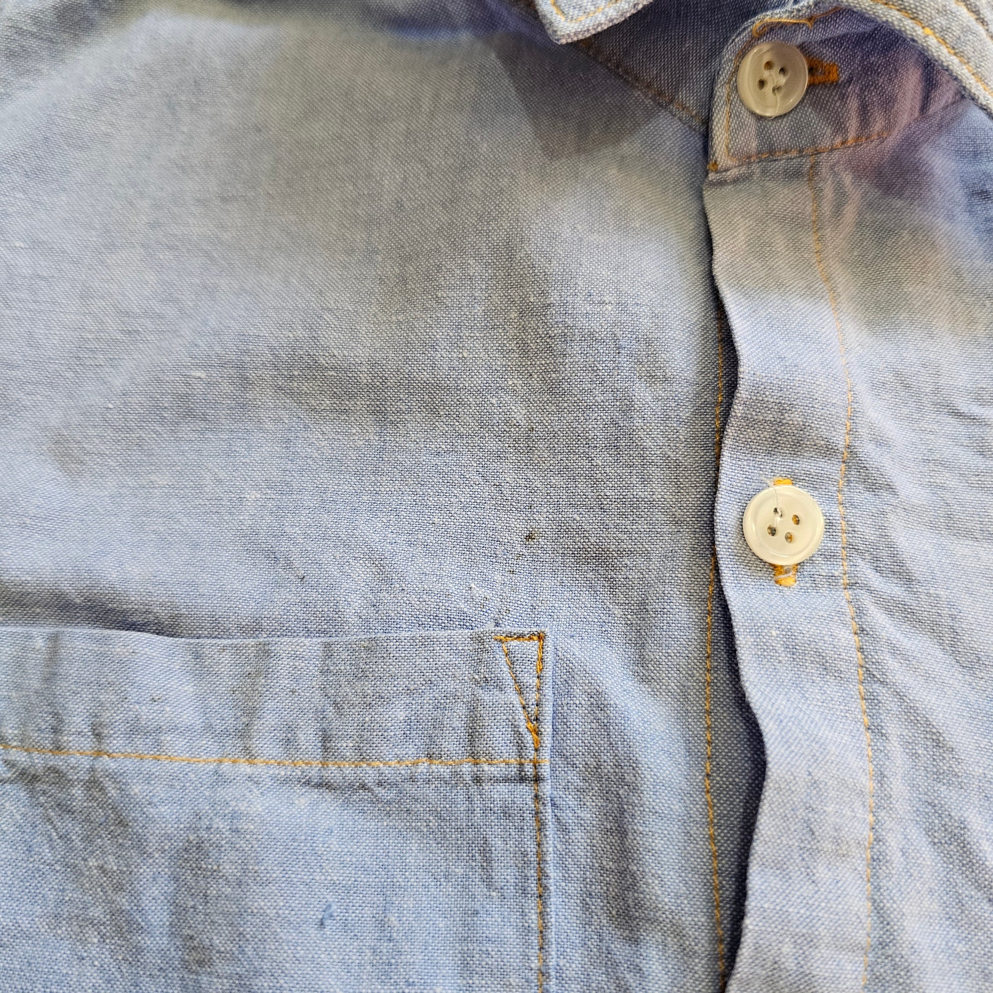 Missing a button, and the tiniest marks above the pocket.